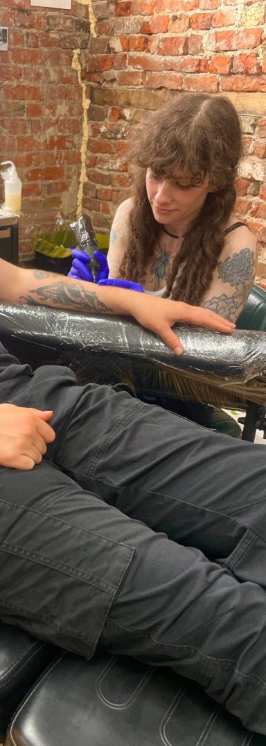 Being a woman in this field has meant pushing through barriers, proving myself through hard work, and carving out space where clients feel safe, respected, and inspired. Over the years, I’ve learned that the needle isn’t just a tool for ink — it’s a way to tell stories, honor identities, and help people wear their confidence on their skin.